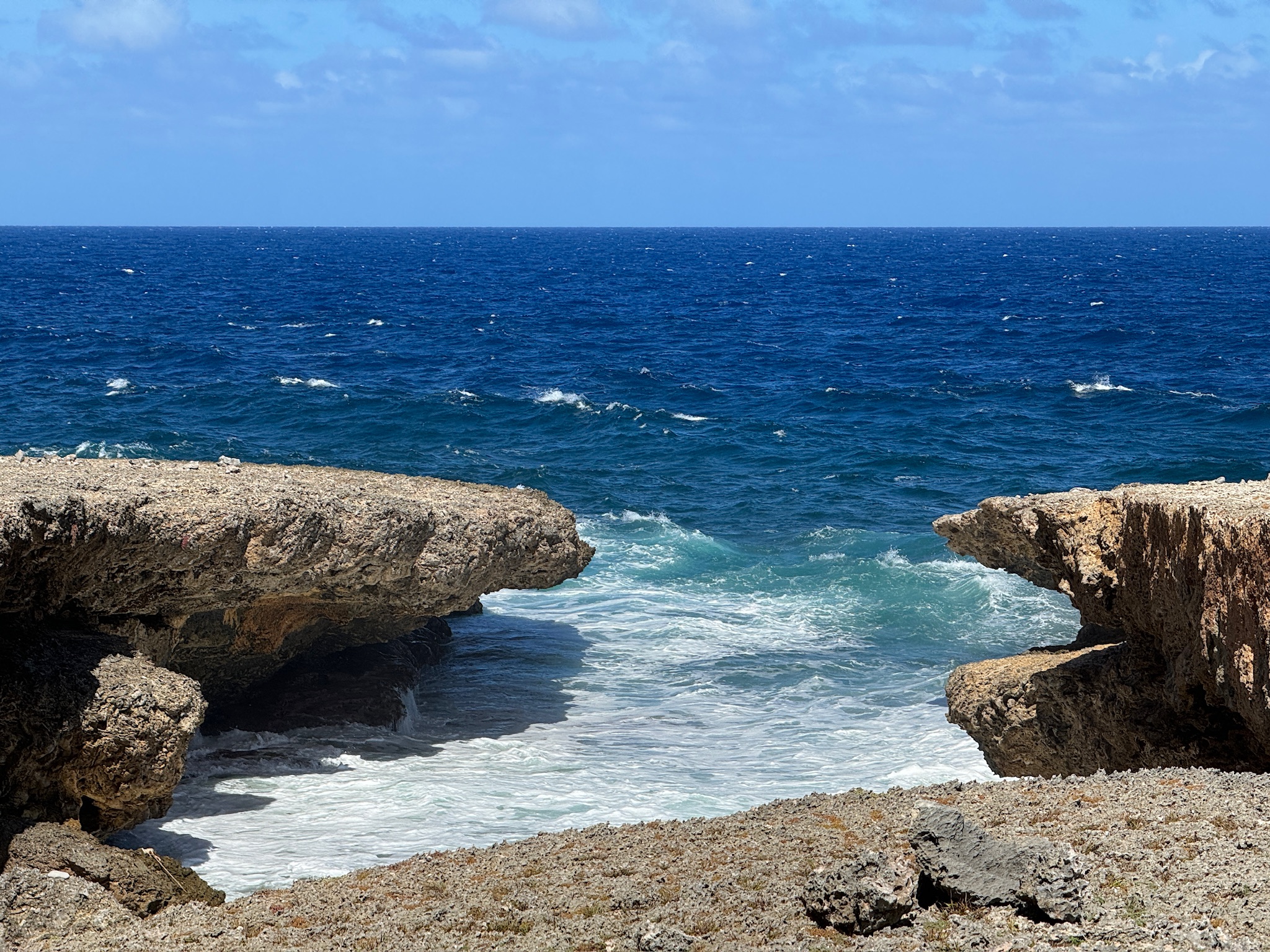 De noordkust, waar de zee voortdurend tegen de rotsen beukt, is steil, ruw en ontoegankelijk. Aan de zuidkust liggen de koraalriffen en een aantal in het kalkkoraal uitgesleten baaien en stranden.